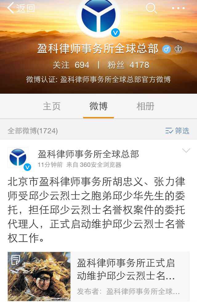 今天上午11時左右,北京市盈科律師事務(wù)所通過其官方微博(@盈科律師事務(wù)所全球總部 )發(fā)布《盈科律師事務(wù)所正式啟動維護邱少云烈士名譽權(quán)工作》的聲明,全文如下:
