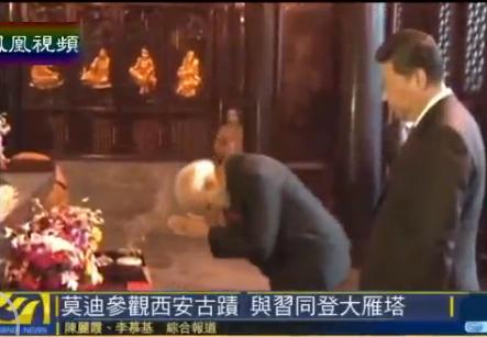 莫迪在大慈恩寺與中國國家主席習近平一起登上紀念玄奘西行的大雁塔。