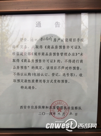 今年3月,當楊女士來到曲江綠地名城售樓部詢問五證辦理情況時,卻發(fā)現售樓部門外張貼著一張落款為西安市住房保障和房屋管理執(zhí)法監(jiān)察隊的通告。