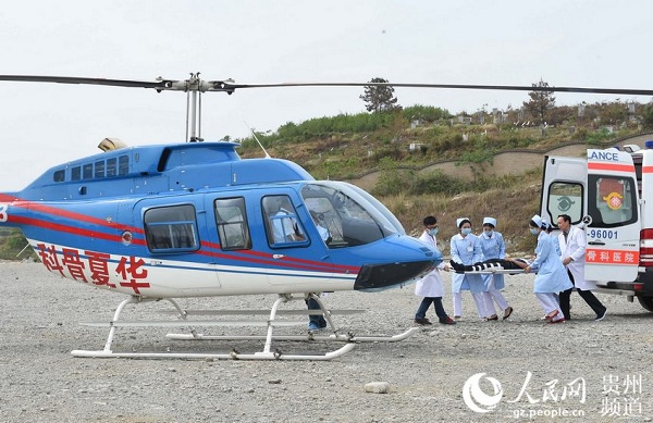 “轟隆隆……”4月20日上午10點(diǎn),救援直升機(jī)從河濱公園起飛,5分鐘不到,就抵達(dá)貴州華夏骨科醫(yī)院。降落,停穩(wěn),機(jī)艙打開后,兩名急救醫(yī)生抬著擔(dān)架小跑上去,把“病人”從直升機(jī)里抬出,迅速送進(jìn)醫(yī)院急救中心。這是醫(yī)院為開展空中救援而舉行的演練,直升機(jī)內(nèi)配備了心肺復(fù)蘇儀、多功能監(jiān)護(hù)儀、便攜式呼吸機(jī)、吸痰器等各類急診搶救設(shè)備和藥品,可以在飛行途中實(shí)施緊急醫(yī)療救援,以著名醫(yī)生領(lǐng)銜的救援團(tuán)隊(duì)將隨時(shí)待命。