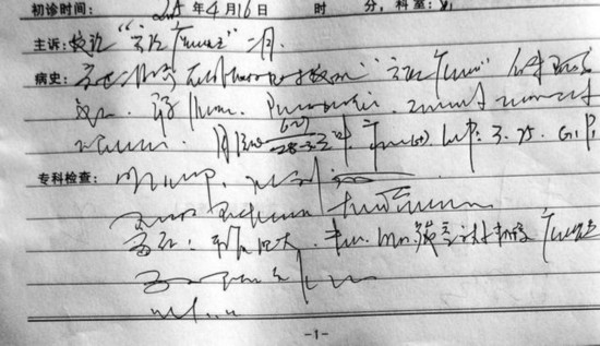 記者昨天來(lái)到西安碑林紅纓醫(yī)院,醫(yī)生出具的病例上,記者除了認(rèn)識(shí)“2015年4月16日”、“二月”的字樣外,其余的兩頁(yè)內(nèi)容都不認(rèn)識(shí),包括醫(yī)師簽名。記者拿著該病歷詢問(wèn)導(dǎo)醫(yī)臺(tái)的護(hù)士時(shí),沒(méi)想到她們回答:“我們也不太清楚,每個(gè)人寫(xiě)字風(fēng)格不同,你最好問(wèn)醫(yī)生去。”