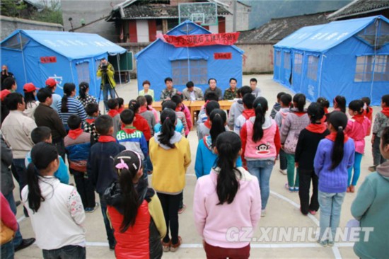 4月1日,師生們?cè)谫F州省劍河縣南加鎮(zhèn)新柳小學(xué)臨時(shí)帳篷課堂上互動(dòng)。新華社發(fā)(彭文貴攝)