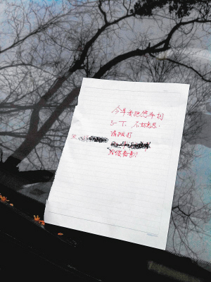 李先生家住紅專南路長慶坊小區(qū),平時代步用的私家車就停在小區(qū)院子里。昨日上午7時許,他急急忙忙出門送孩子上學?!败囶^被剮蹭了,我當時還挺生氣?!崩钕壬f,由于不知道是誰干的,他只好打算先送孩子去上學。拉開車門時,李先生發(fā)現(xiàn)車前擋風玻璃上有一張紙條。