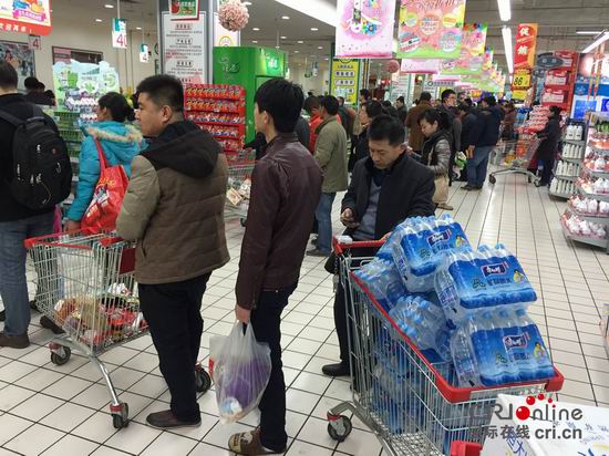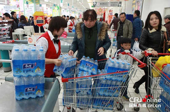 2015年3月4日,蘭州,市民反映七里河區(qū)新華印刷廠一帶自來水出現(xiàn)消毒水味。圖為市民在超市采購瓶裝水