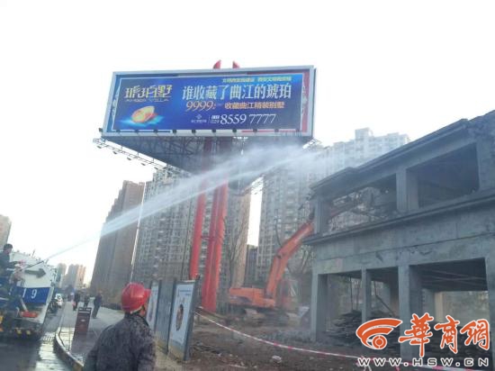 今天下午,家住曲江大道北池頭的市民王女士發(fā)現(xiàn),附近綠化帶上一處蓋了幾個月的公廁還沒建完呢,卻又開始拆了。華商記者今晚6時許接到反映后趕到現(xiàn)場看到,一輛挖掘機正在拆除板房的二樓,旁邊還有一輛灑水車不斷灑水降塵。