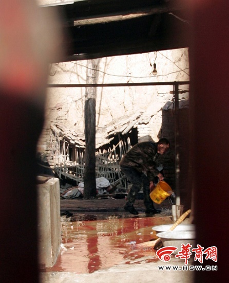 通過(guò)上游一家宰羊作坊的門縫可以清楚地看到,院內(nèi)地上全是沖洗后的動(dòng)物血水,血水通過(guò)一根污水管道直接排入河溝中,溪水瞬間變成了血紅色。在宰羊作坊的附近,一家食品廠通過(guò)排污管道,將企業(yè)產(chǎn)生的廢水和半成品粉條排入小溪內(nèi),有的半成品粉條已經(jīng)腐爛惡臭。