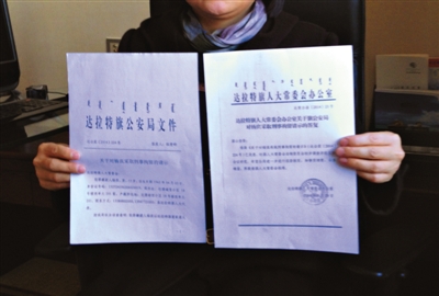 達(dá)拉特旗公安局2014年9月2日提請刑拘人大代表楊賓的申請(左),該旗人大常委會9月29日的否決回復(fù)(右)。