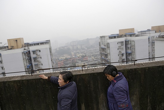 劉成碧和同伴在安置房樓頂,外面是已經(jīng)建設(shè)好的高樓大廈,他說外面的人都以為他們住在高樓大廈里條件好生活好,其實他們不知道我們一分錢都沒有有多苦。