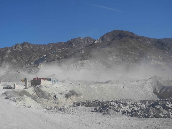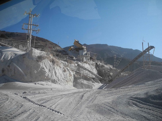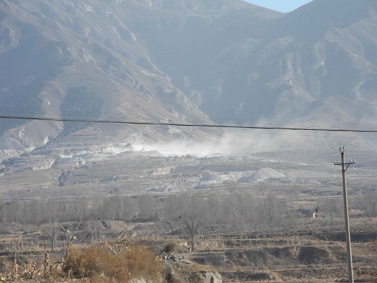 從關(guān)城村邊進(jìn)入,沿著崎嶇不平的土路,穿過(guò)忻保高速橋底,順著粉塵找到了這座石料廠。廠區(qū)周圍不間斷的粉塵沿大山腳下飄揚(yáng),灰蒙蒙的石料廠映入我們的眼簾,廠地一片繁忙的景像,熱火朝天,在露天堆放的成品料堆前,幾輛大卡車正在裝石料,沒(méi)有任何防塵措施,裝載機(jī)將石料鏟起倒入卡車車廂時(shí),粉塵騰空而起,污染不言而喻,滿載石料的車輛也沒(méi)有加蓋苫布。山腳下的耕地和草木已看不出本來(lái)的面貌,一座簡(jiǎn)易的房子,也在粉塵的籠罩下,占立于廠區(qū)下方,這就是廠區(qū)的辦公間,屋頂屯集了厚厚的粉塵,整個(gè)廠區(qū)在沒(méi)有任何圍欄、除塵、降塵的設(shè)施下生產(chǎn)。