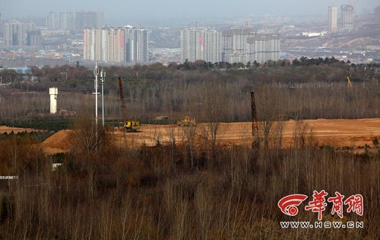 12月15日下午4時(shí)許,在城南雁翔路南端以東的月亮彎路上,近10臺(tái)挖掘機(jī)、打夯機(jī)正在道路一旁的農(nóng)田內(nèi)作業(yè),挖掘機(jī)將黃土堆起近10米高,夯土機(jī)不停地夯土筑實(shí)。