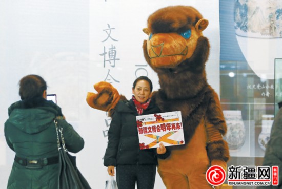 8日,一名觀眾拿著“新疆文博會明年再來!”的牌子和本屆文博會的使者“文駝駝”合影留念。(記者蔣曉攝)