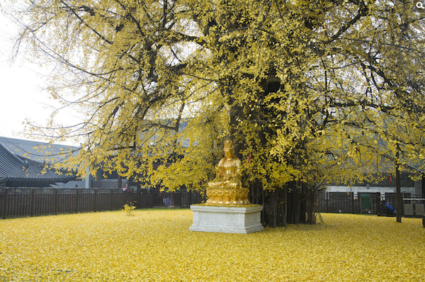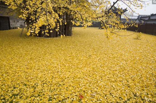 11月27日,西安市長安區(qū)東大街辦羅漢洞村的古觀音禪寺,一棵1400多年樹齡的銀杏樹下落滿黃葉,像金黃的地毯鋪了一地,來看落葉的人絡(luò)繹不絕。據(jù)傳,這棵銀杏樹是當年唐太宗李世民親手栽種,距今已有1400多年歷史,已被國家列為古樹名木保護名錄。彭華/東方IC