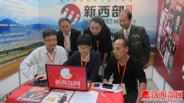 陜西浮陸文化科技發(fā)展有限責(zé)任公司總經(jīng)理吳彤飛(右二)等執(zhí)委會(huì)成員在展館外研究工作。新西部網(wǎng) 王順利攝