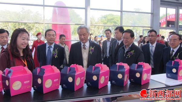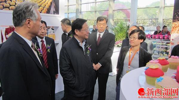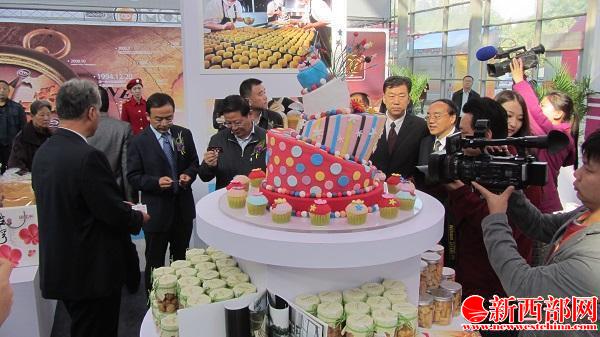陜西振彰食品有限公司大客戶部主管楊媛婷(前左二)向陜西省質(zhì)量技術(shù)監(jiān)督局黨組書記、局長(zhǎng)仵西居(前左一)介紹御品軒蛋糕。新西部網(wǎng) 王順利攝