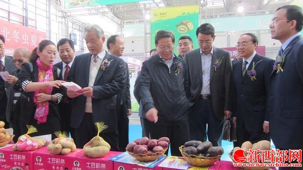 涌泉居(靖邊)現(xiàn)代農(nóng)業(yè)科技服務(wù)有限公司銷售部部長(zhǎng)郭亞麗(前左一)陪同陜西省質(zhì)量技術(shù)監(jiān)督局黨組書記、局長(zhǎng)仵西居(前左二),陜西省第十一屆人大常委會(huì)原秘書長(zhǎng)、陜西省政府參事、國(guó)際應(yīng)急管理學(xué)會(huì)中國(guó)委員會(huì)副主席桂維民(前左三)等領(lǐng)導(dǎo)參觀涌泉居(靖邊)現(xiàn)代農(nóng)業(yè)科技服務(wù)有限公司展位。新西部網(wǎng) 王順利攝