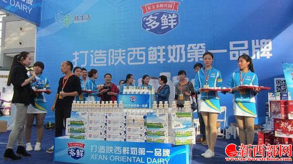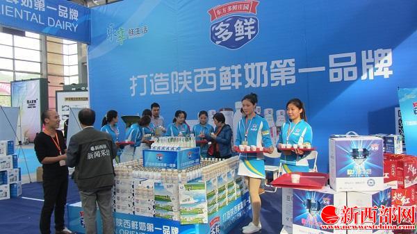 西安東方乳業(yè)有限公司社區(qū)部經(jīng)理王小牛(左三)向新西部網(wǎng)介紹“多鮮”品牌產(chǎn)品。新西部網(wǎng) 王順利攝