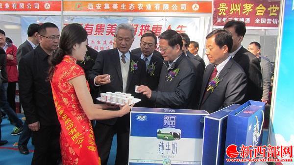 西安東方乳業(yè)有限公司社區(qū)部經(jīng)理王小牛(前右三)向陜西省質(zhì)量技術(shù)監(jiān)督局黨組書記、局長(zhǎng)仵西居(前右二),陜西省第十一屆人大常委會(huì)原秘書長(zhǎng)、陜西省政府參事、國(guó)際應(yīng)急管理學(xué)會(huì)中國(guó)委員會(huì)副主席桂維民(前右一)等領(lǐng)導(dǎo)介紹“多鮮”乳品。新西部網(wǎng) 王順利攝