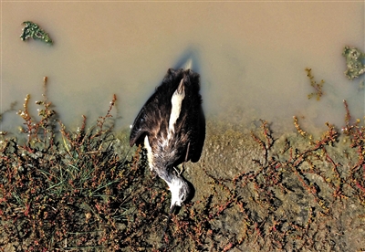 順著查漢淖爾湖西南方向行走,在湖邊的草地上、沙土上和靠岸的水里,不斷發(fā)現(xiàn)有死亡的鳥兒。沿湖走過300多米,記者仔細(xì)數(shù)了數(shù),死去的鳥兒達(dá)到200多只,還有鳥兒在湖邊淤泥中掙扎著。