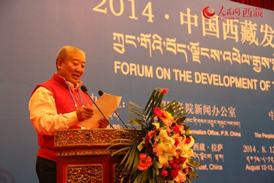 中國(guó)藏學(xué)研究中心副總干事洛桑·靈智多杰在2014·中國(guó)西藏發(fā)展論壇閉幕式上宣讀《拉薩共識(shí)》。記者 楊慶軍 攝