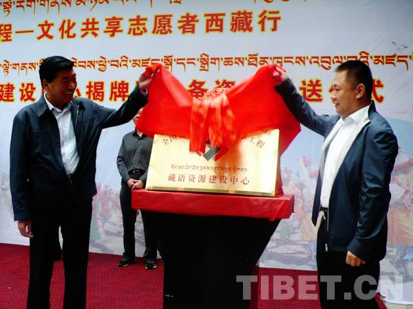 7月12日上午,2014年春雨工程——文化共享志愿者西藏行,文化共享工程藏語資源建設(shè)中心揭牌暨設(shè)備資源贈(zèng)送儀式在西藏圖書館里舉行。西藏自治區(qū)黨委宣傳部副部長(zhǎng)、自治區(qū)文化廳廳長(zhǎng)尼瑪次仁、全國(guó)公共文化發(fā)展中心副主任李建軍出席了設(shè)備捐贈(zèng)儀式。