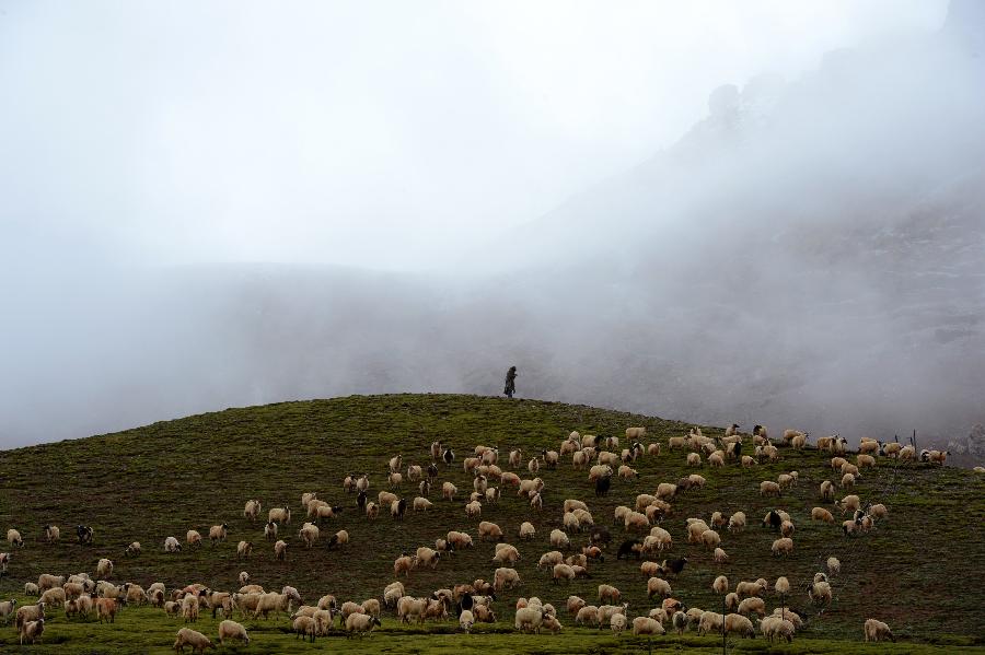 草原、冰雪、云霧、羊群,共同構(gòu)成夏季納木錯景區(qū)美麗畫卷(6月29日攝)。