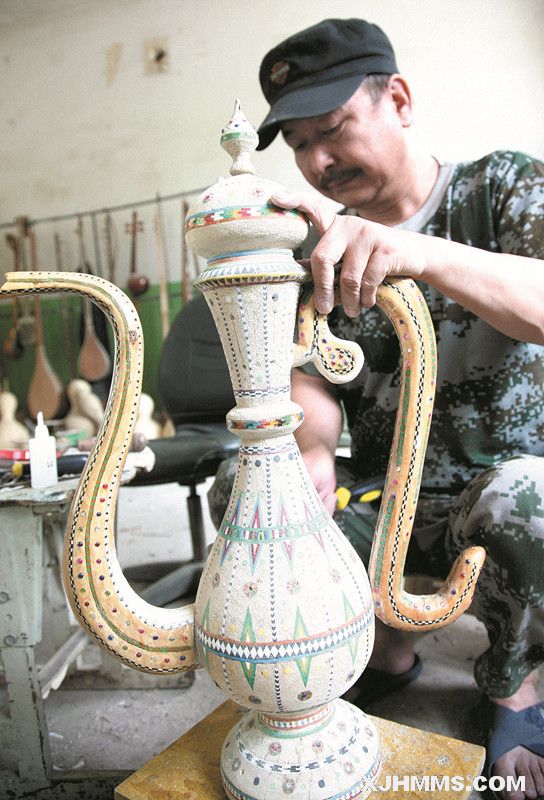 阿不列孜·艾買提告訴記者,去年自己親手制作的艾捷克、彈布爾有6件作品有幸參展。去年8月就開始為今年瓜節(jié)參展作品做準備,每件作品從選料、做模型、雕刻、鑲嵌到成品至少花費一個月時間,現(xiàn)在全校有10多件已經(jīng)完成?!拔宜龅臇|西都是哈密特色的東西?!卑⒉涣凶握f,為了傳統(tǒng)手工藝的傳承今年特意做了一個1.7米高的茶壺。