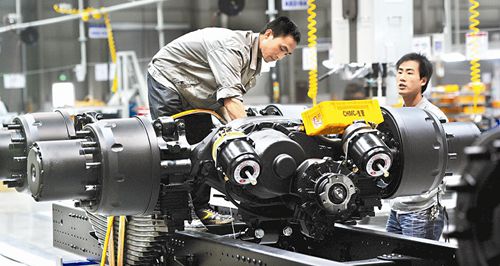 總投資200億元的四川現(xiàn)代汽車(chē)有限公司,一期工程已完成,載重卡車(chē)實(shí)現(xiàn)量產(chǎn)。圖為卡車(chē)部工人正在生產(chǎn)線(xiàn)上組裝卡車(chē)部件。