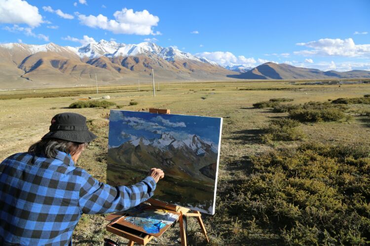 陳大衛(wèi)表示,高山救援基金屬非盈利性基金,它的維系需要社會力量的參與和支持,在歷次的登山繪畫中,他得到了充分的保障,所以他也是受益者。本次登山公益拍賣,他捐出兩幅畫拍得的10萬元,也為高山救援基金的延續(xù)注入了一滴血液。圖為陳大衛(wèi)現(xiàn)場作畫。(中國西藏網(wǎng) 文\馬靜)