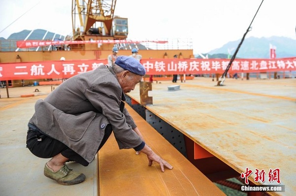 北盤(pán)江大橋最后一塊橋面板安裝完畢。中新社記者 賀俊怡 攝 (來(lái)自:中新網(wǎng))