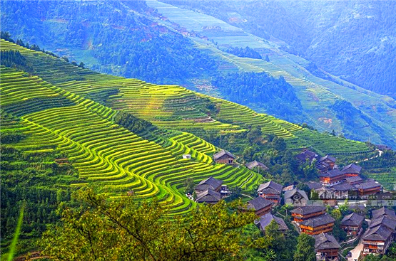 進入9月,龍勝各族自治縣泗水鄉(xiāng)潘內村梯田景呈現(xiàn)“大地染金”的美麗景觀。層層疊疊的梯田、錯落有致的民族村寨、涓涓細流的小溪、蜿蜒崎嶇的農村公路相互交織在一起,形成了一幅幅色彩斑斕的天然油畫,美不勝收。
