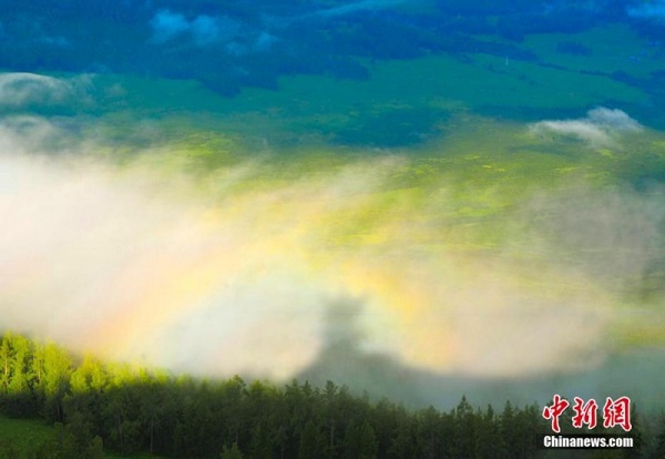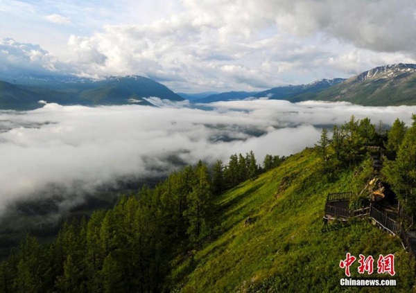 7月3日,經(jīng)過一場大雨的洗禮,新疆北部喀納斯景區(qū)出現(xiàn)云海、佛光兩大自然奇觀。當(dāng)日清晨,隨著太陽慢慢升起,云海在山谷間逐漸形成,翻滾在山間蔓延,很快就將整個(gè)山谷填滿。在該景區(qū)至高點(diǎn)觀魚亭舉目遠(yuǎn)眺,便可一覽“云海填谷”的壯觀景象。據(jù)介紹,6、7月正是喀納斯山區(qū)雨水較為充沛的季節(jié),加之景區(qū)內(nèi)繁茂的植被,水汽蒸發(fā)蒸騰的速度快。每當(dāng)太陽升起,隨著溫度的變化凝結(jié)成云,形成云海。