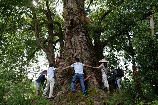 2016年06月23日,貴州省遵義市,在貴州省余慶縣白泥鎮(zhèn)新寨村,看到該村同心組一株樹干直徑約3.8米、樹干中下部周長為14.8米、樹高約20米的黃梨古樹。古樹需要9人手拉手才能抱住。