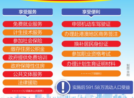 流動(dòng)人口在居住地拿到居住證后,可享受到12項(xiàng)基本公共服務(wù)和七項(xiàng)便利。