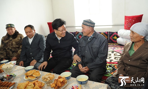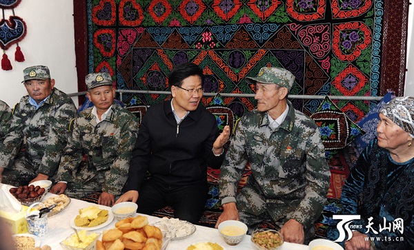????“馬合薩提,你好??!”張春賢一眼就認(rèn)出了老朋友,2011年他來這里調(diào)研時,就曾看望慰問過馬合薩提一家。現(xiàn)如今,馬合薩提從父親手中接過馬鞭、守邊護(hù)邊30余載的模范事跡已經(jīng)編入了兒童教育讀本。張春賢與護(hù)邊員們一一握手互致問候,走進(jìn)護(hù)邊員阿布力汗家中,與大家圍坐在一起,逐一詢問他們的家庭生活情況和對護(hù)邊工作的建議。