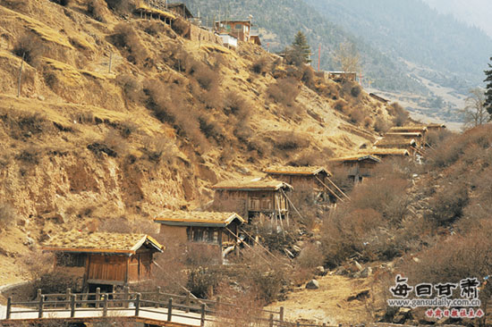 這是一個(gè)以農(nóng)牧業(yè)為主的藏族古村寨。山寨的四周大都開(kāi)墾出了一塊連一塊的以種植糧食為主的田地。就是在庭院內(nèi),村民們也盡可能地利用園地種植蔬菜。在房屋四周還搭架著一排排放置、曬干農(nóng)作物的麥架桿,與錯(cuò)落有致的榻板房構(gòu)成山鄉(xiāng)的一道獨(dú)特風(fēng)景線。