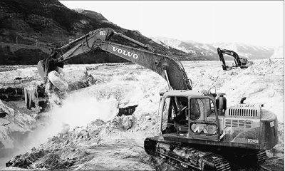 2月16日,山西省臨汾市吉縣黃河壺口瀑布景區(qū)工作人員用挖掘機鏟除堆冰。