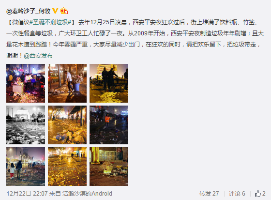 編者按:今天是平安夜,馬上就是圣誕,新年也漸漸靠近,節(jié)日氣氛越來越濃郁,可以想象西安市中心喧鬧的人群和琳瑯滿目的商場,在你狂歡的時候請留下美麗、留下文明,帶走垃圾,讓清潔工在寒冬早點下班!