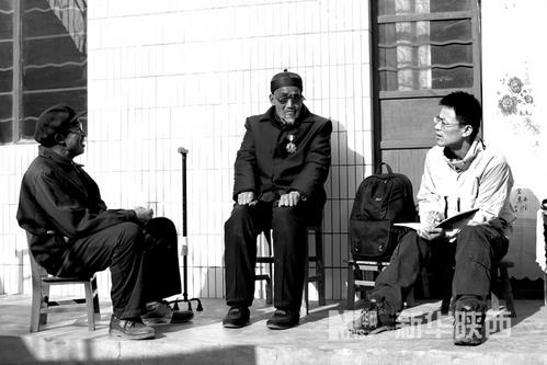 2012年12月1日,在長(zhǎng)武彭公高家坡村,李鵬濤采訪曾參加國(guó)民革命軍第38軍17師的94歲抗戰(zhàn)老兵魏邦儒。楊彬攝