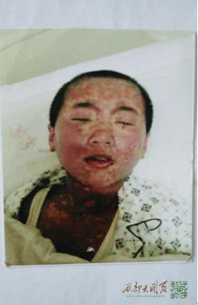 2014年2月12日,劉洋因?yàn)楦忻案邿驮\于榆林一診所,被診斷為皮疹。一天后仍然高燒不退,于2月14日以“急性化膿性扁桃體炎皮疹待查”入住榆林市第一醫(yī)院小兒科,入院診斷為葡萄球菌性燙傷皮膚綜合征;急性化膿性扁桃體炎;大皰性表皮壞死性松懈型藥疹,住院8天后劉洋在媽媽的強(qiáng)烈要求下轉(zhuǎn)院了,于2014年2月21日以“全身紅斑、水皰伴發(fā)熱10天”入住于第四軍醫(yī)大學(xué)唐都醫(yī)院。根據(jù)唐都醫(yī)院住院病例記載:劉洋以“SSSS”入住榆林市第一醫(yī)院住院,住院期間給予“能量合劑、頭孢替安等藥物”,未能控制病情,一天后改用甲強(qiáng)龍80mg靜滴,并給予免疫球蛋白等藥物靜滴,皮損繼續(xù)加重,全身皮膚出現(xiàn)大皰,并多處潰爛,體溫最高41℃,且伴有便血。??魄闆r為:全身表皮剝脫,可見大小不等的松弛性水皰,大皰破潰、局部形成糜爛,背部及臀部等受壓部位表皮剝脫明顯,并有表皮壞死,血性及漿液滲出較多,觸痛明顯。眼瞼、口腔粘膜、外耳道及外陰等腔口部位均糜爛、破潰。