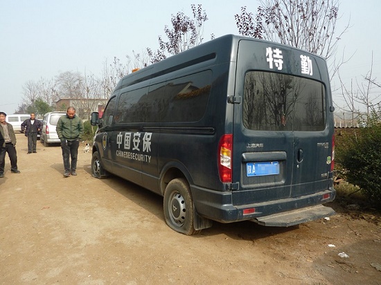 12月1日,記者在寇家村東看到,兩輛小轎車和三輛面包車停在路邊,每輛車均有一兩個(gè)輪胎癟癟的已被放氣,兩頭各有一輛小轎車堵住了出路。這五輛車均有牌照,其中一輛藍(lán)色面包車車頂安有紅藍(lán)兩色警燈,車身有“中國(guó)安?!薄ⅰ疤厍凇弊謽?。