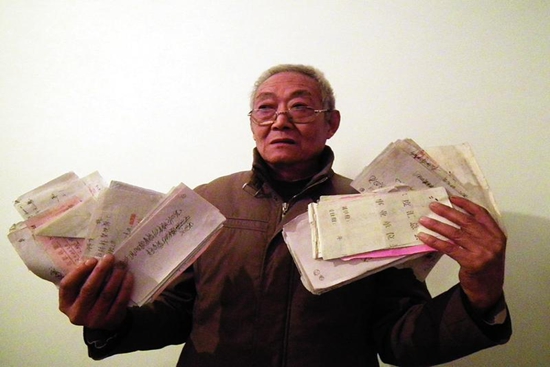 原村會計(jì)兼出納黃聲貴手里拿著上百張村干部報(bào)賬的白條