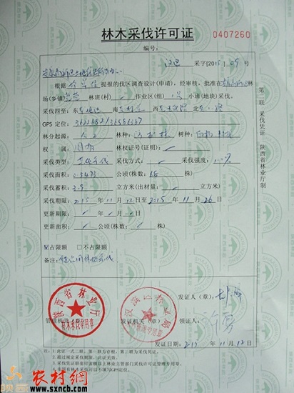漢濱區(qū)林業(yè)局頒發(fā)的采伐許可證