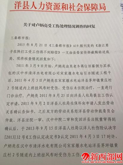 8月21日,浙江省縉云縣大源鎮(zhèn)土魚坑村村民盧炳亮在陜打工受工傷得不到賠償?shù)男侣剤?bào)道后,漢中市洋縣人力資源和社會保障局給出了關(guān)于對盧炳亮受工傷處理情況調(diào)查的回復(fù)。