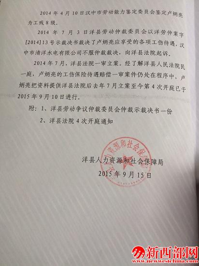 《回復(fù)》最后稱:“2014年7月,洋縣法院一審立案。經(jīng)了解洋縣人民法院民一庭,盧炳亮的工傷保險(xiǎn)待遇賠償一審案件仍處在程序中,盧炳亮把資料提供洋縣法院后去年7月立案至今第四次開庭已于2015年9月10日進(jìn)行?!?/p>