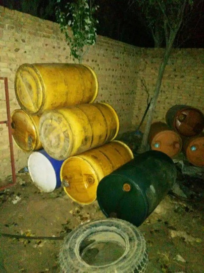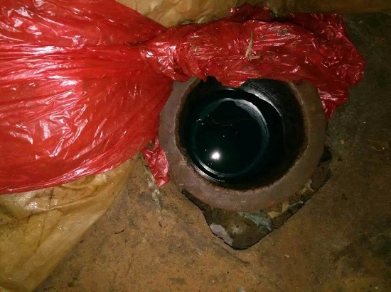 10月22日記者實地走訪,發(fā)現(xiàn)該窩點藏身于靖邊寨山永寧連鎖加油站向西20米處交通飯店貨運信息停車場院內(nèi)。在院內(nèi)的墻角,記者發(fā)現(xiàn)到處油跡斑斑,大小油桶扔的到處都是,在一塊虛掩的塑料布下面有存放柴油的油罐。罐體掩埋在土里,(從灌口口徑目測,至少20噸以上)只留有井蓋大小的口子,里面盛滿了柴油。