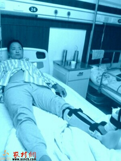 2015年10月23日中午,記者來(lái)到位于文林路上的延安大學(xué)咸陽(yáng)醫(yī)院(二十局醫(yī)院),見(jiàn)到了求助的42歲西郭村村民的張鋒,此時(shí),張鋒正躺在床上,左腳兩處嚴(yán)重骨折剛做完手術(shù)。說(shuō)到被打的事情,張峰一臉的委屈。他說(shuō)最近他的侄子在離村子不遠(yuǎn)的工地里承包了工程,他便在那里打工,可在施工過(guò)程時(shí),村支書(shū)張某帶人在工地阻擋,迫使工地施工時(shí)常終斷。