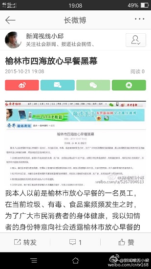 我本人以前是榆林市放心早餐的一名員工,在當前垃圾、有毒、食品案頻頻發(fā)生之時,為了廣大市民消費者的身體健康,我以知情者的身份特意向社會透露榆林市放心早餐的黑幕,希望得到社會各界的關注。