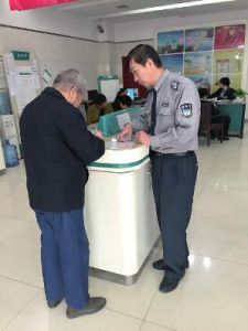 保安、穿便服女子指導(dǎo)填寫單據(jù)、辦業(yè)務(wù)