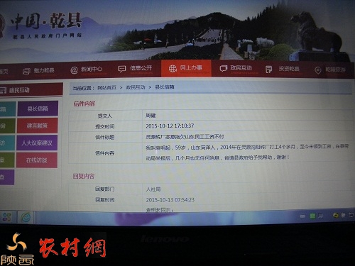 據(jù)了解,10月12日,袁明起委托他人,在《乾縣人民政府網(wǎng)》“縣長(zhǎng)信箱”,以《靈源磚廠惡意拖欠山東民工工資不付》為題進(jìn)行投訴。