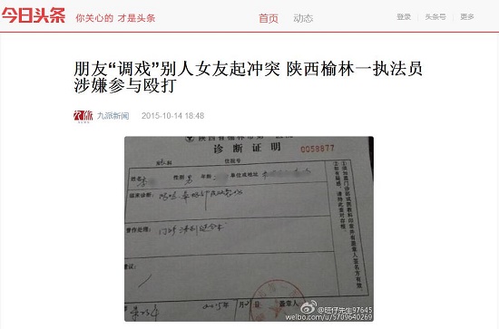 14日下午,發(fā)布此消息的當(dāng)事人李某告訴九派新聞?dòng)浾撸?015年7月18日凌晨1點(diǎn)左右,他和朋友姬某在榆林某KTV玩,隨后遭到樊某和賈某等四、五個(gè)人毆打。李某指稱(chēng)樊某是榆林市城市管理綜合執(zhí)法局某分局執(zhí)法員。